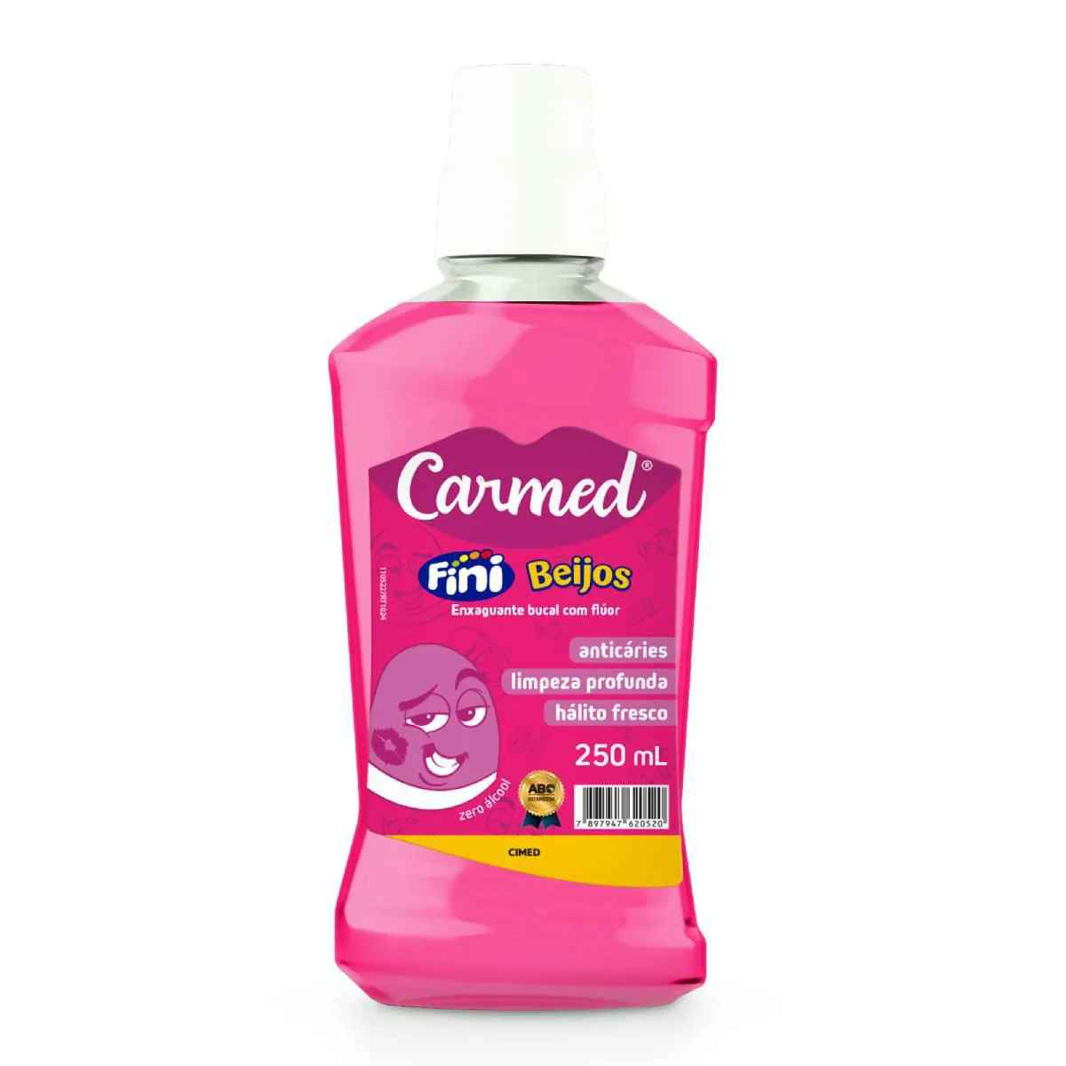 O Enxaguante Bucal Carmed Fini com sabor da bala Fini Beijos possui flúor e ação anticárie, além de realizar uma limpeza profunda e hálito fresco. Sua fórmula é zero álcool e não testada em animais.